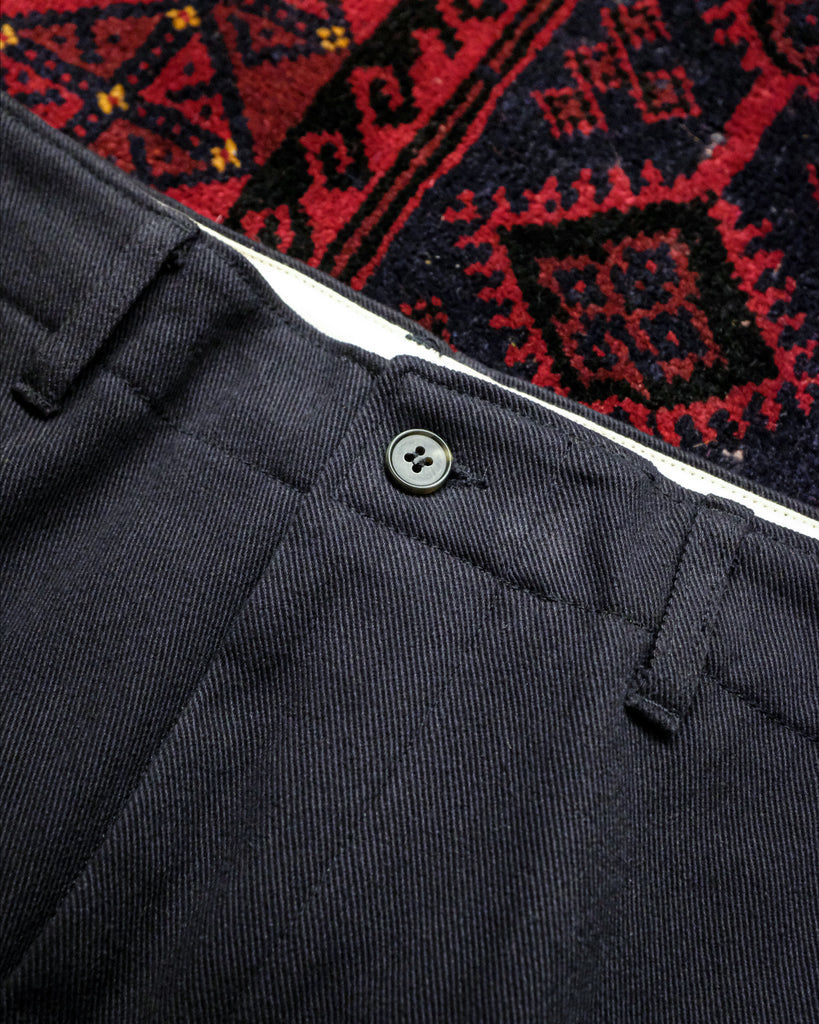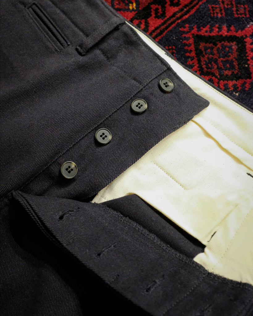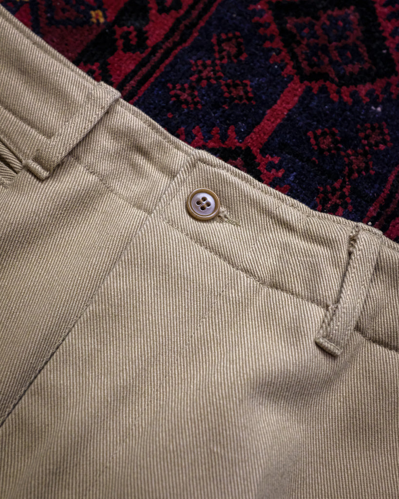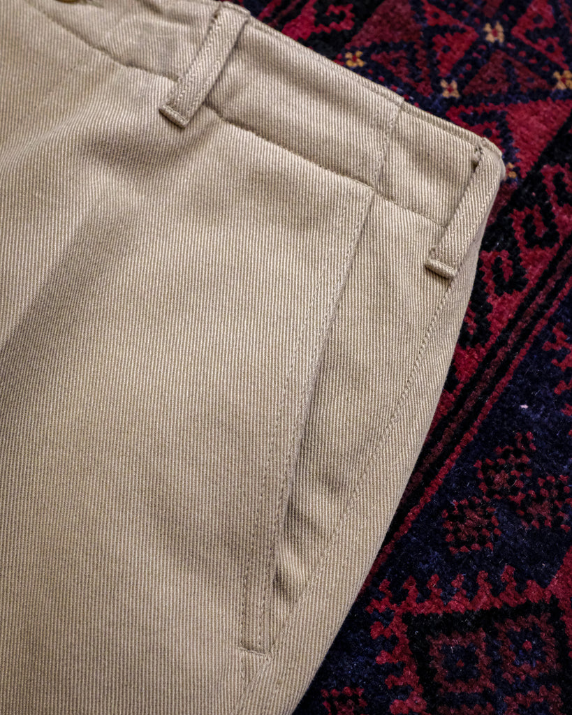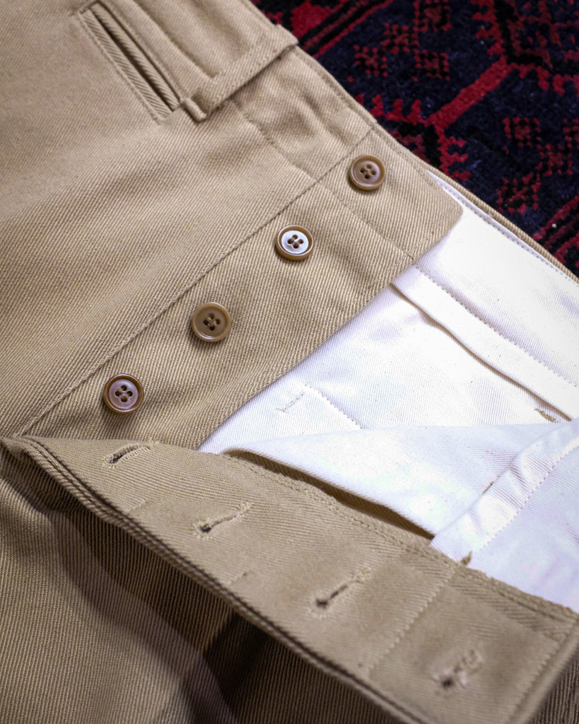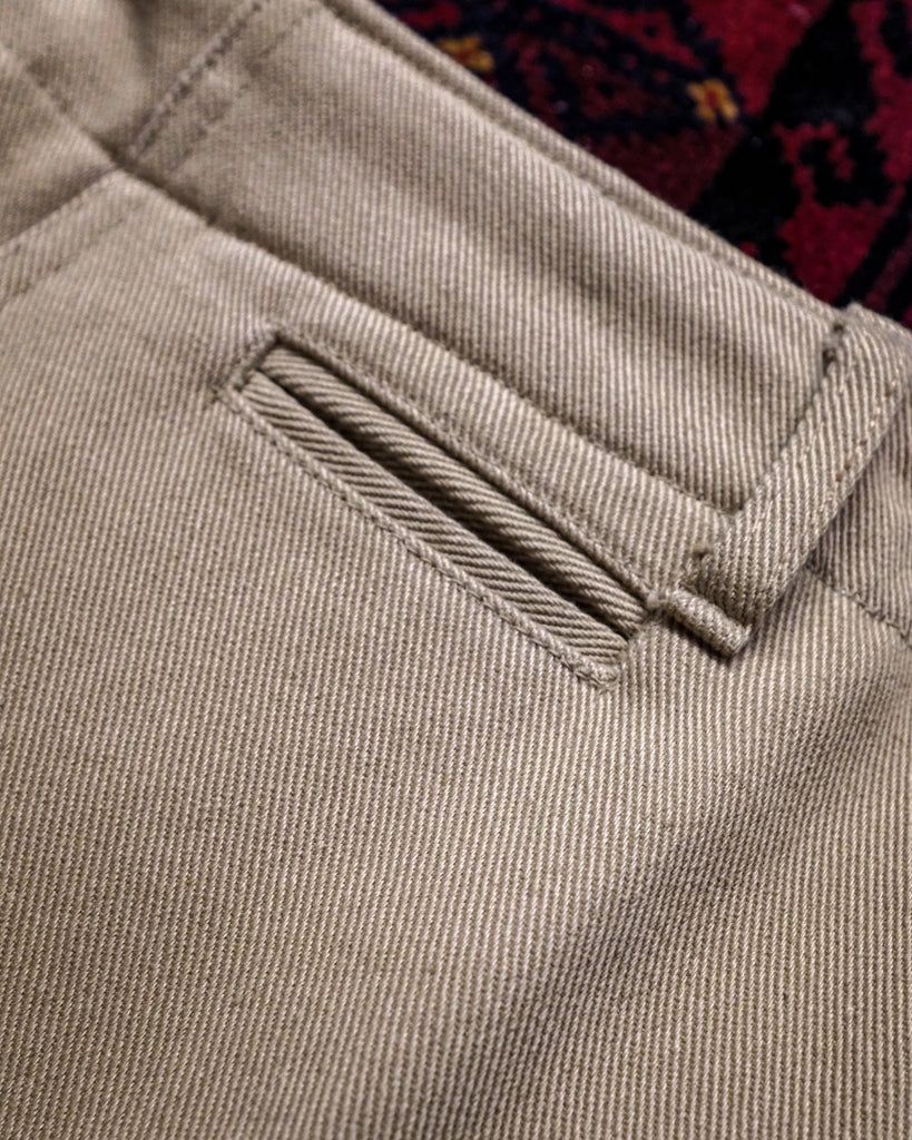 These are heavy twill cotton trousers made in a dressy style based on the original military chinos from the 40s.