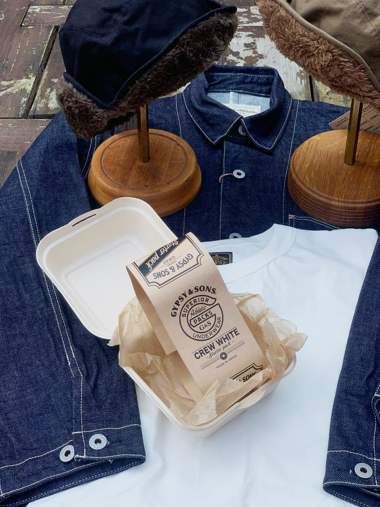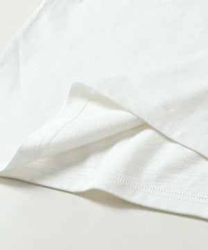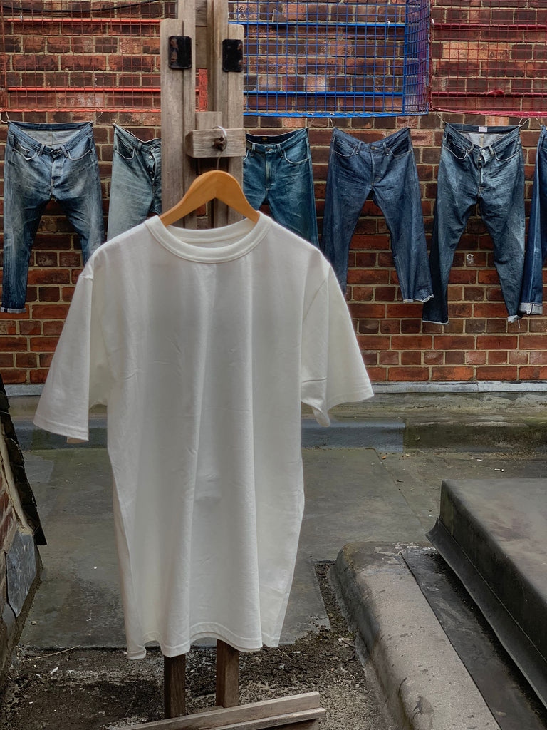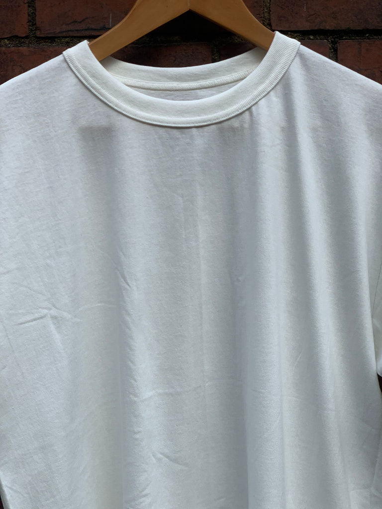 T-Shirt includes a sturdy crew neck T-shirt made from 20th count air-spun jersey and hamburger wrapping in white.This garment is not dyed or washed. The unique texture of the jersey fabric emerges as it is worn and washed repeatedly.