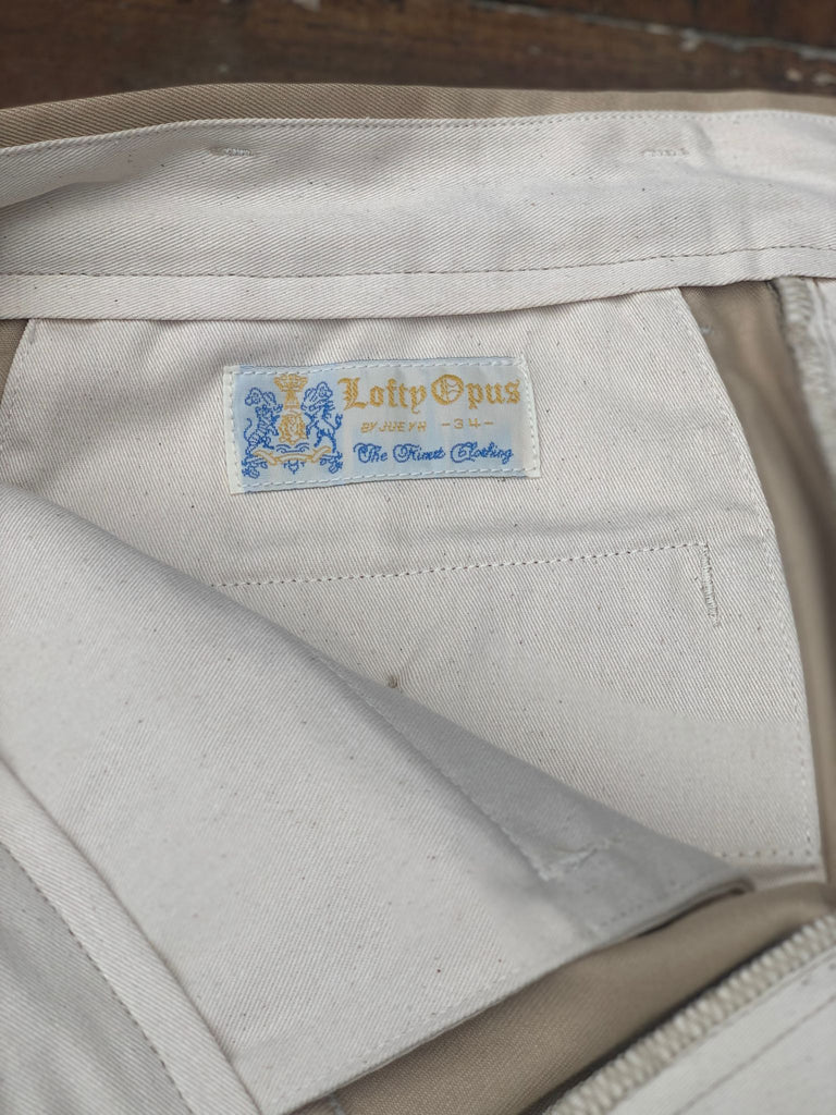 These trousers feature a silhouette, lining-making technique, narrow belt loop, and a button fly detail that were popular from the 1930s to the 1940s.