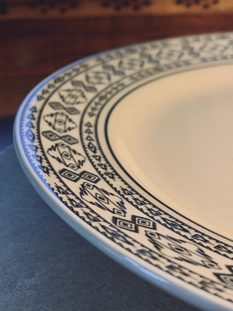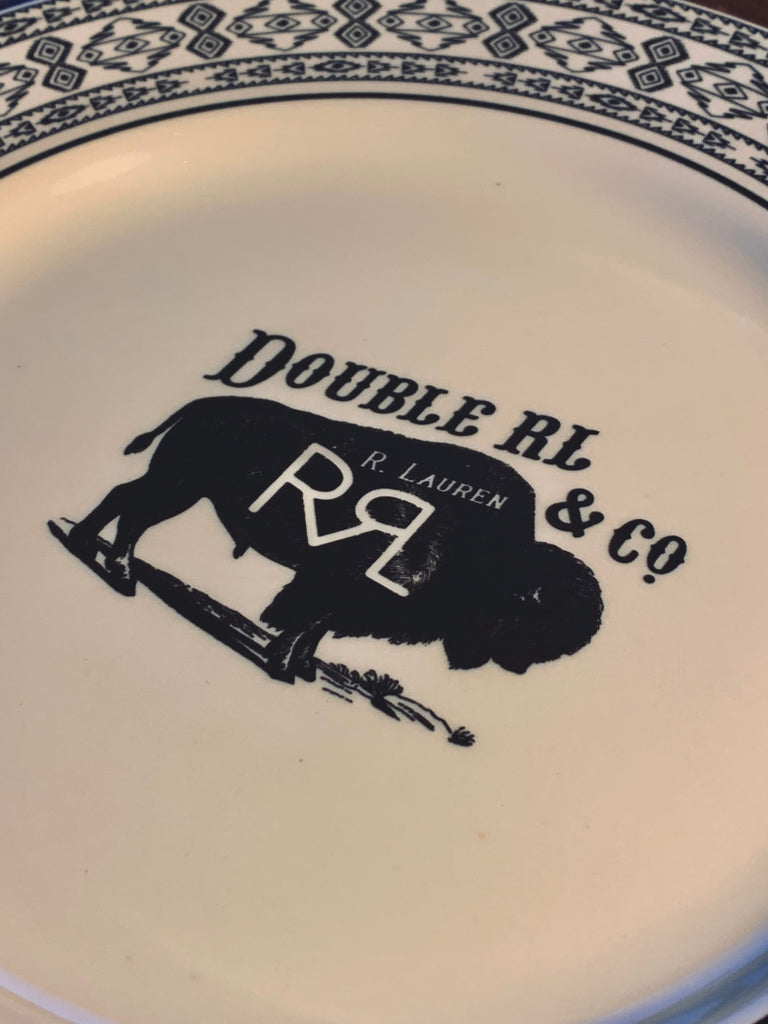 RRL ceramic plate with Navajo South Western print and bison logo graphic.