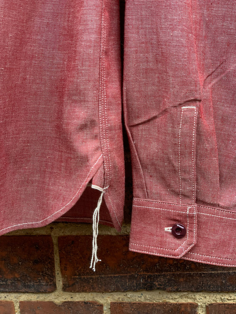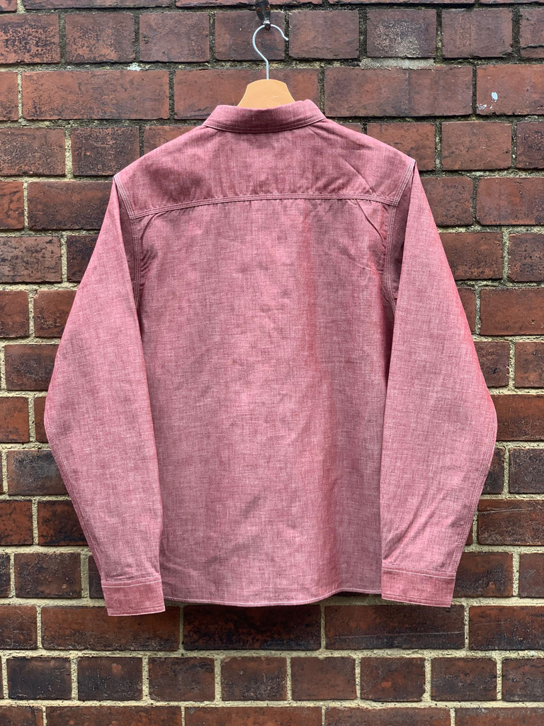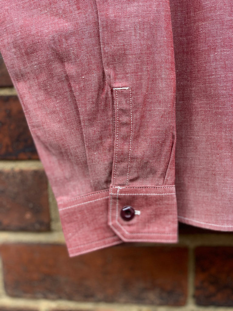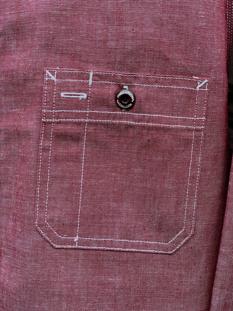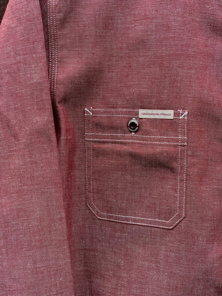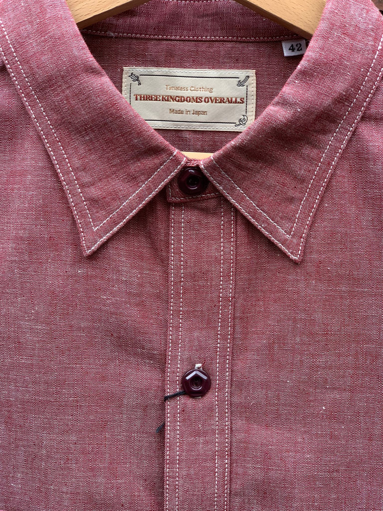 Three Kingdoms Overalls chambray shirt, featuring 5oz yarn-dyed selvedge chambray fabric, stand/pointed collar, back yoke double stitched, 14mm diameter brass metal buttons with a glossy paint finish, satin weave Three Kingdoms branding, triple stitch and double stitch sewing, finished with reinforcement on the pocket openings and arm openings.