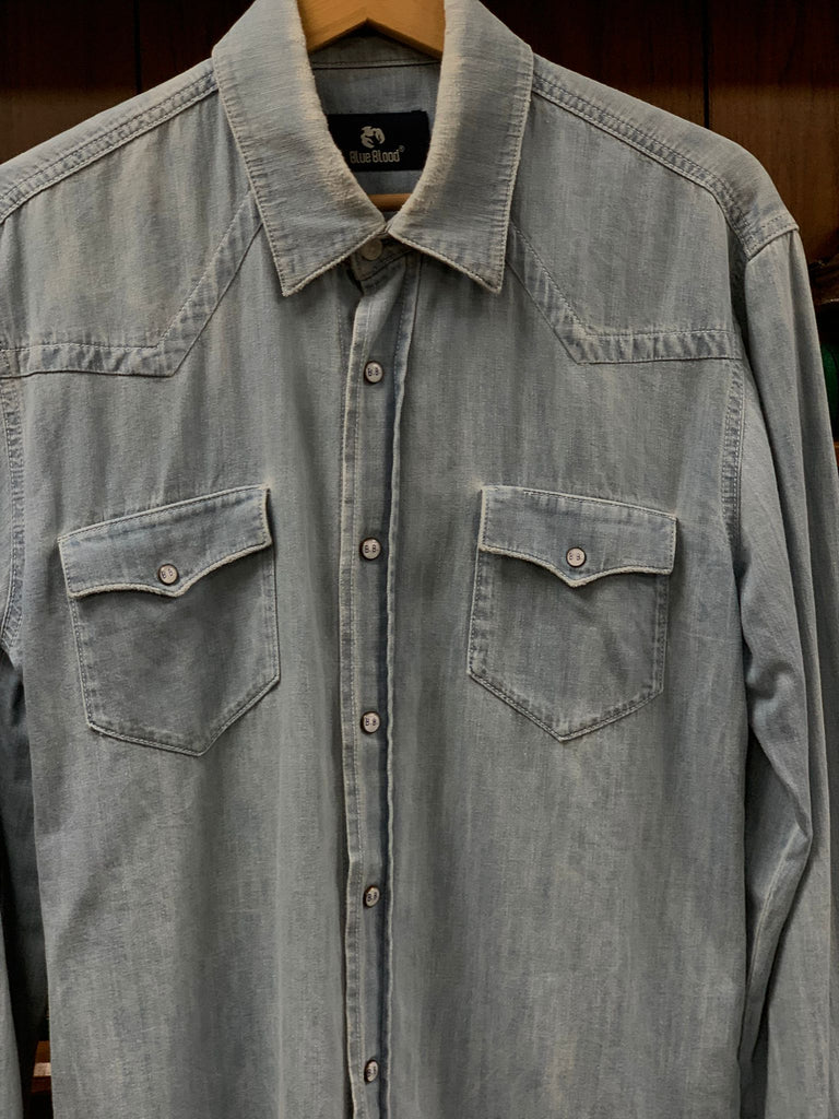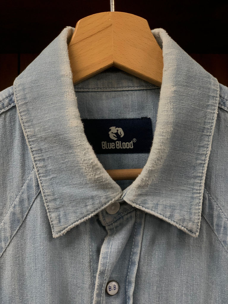 Blue Blood - Vintage Denim Shirt, the perfect blend of style and comfort. Made with high-quality denim, this shirt offers durability and a timeless look. Its vintage design exudes a sense of sophistication and the blue color adds a touch of elegance. Elevate your wardrobe with this classic piece.