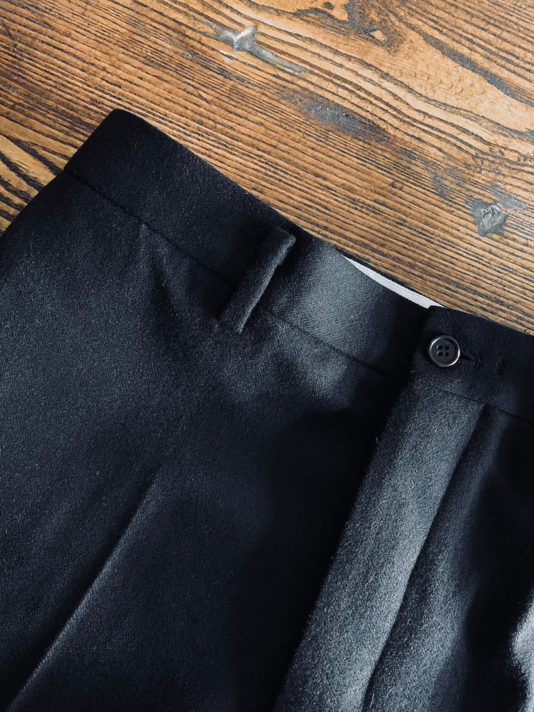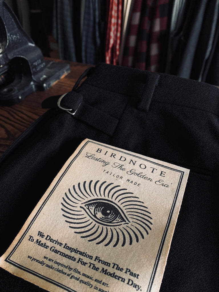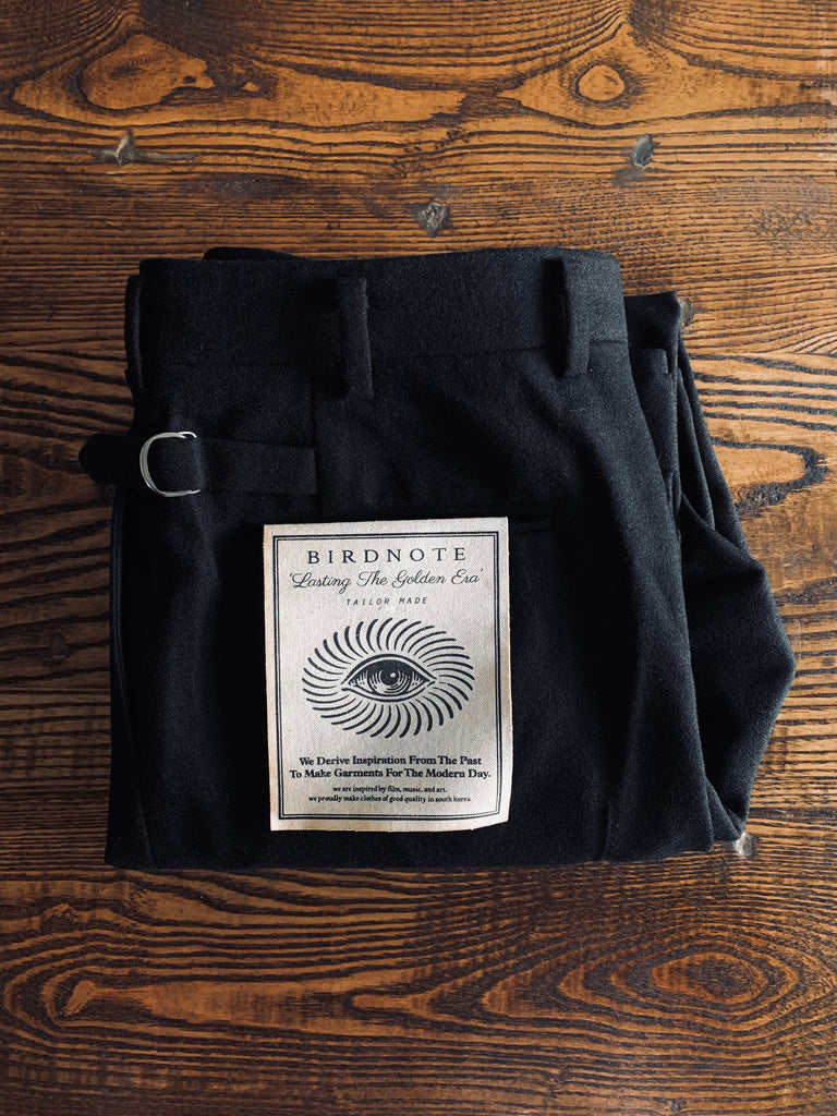 Birdnote's 1930s inspired trouser, with a straight silhouette. The fabric is 100% dead-stock herringbone wool, woven using a traditional method. The details include natural cow horn buttons, and advanced sewing techniques to fit the trouser with a cotton partial lining.