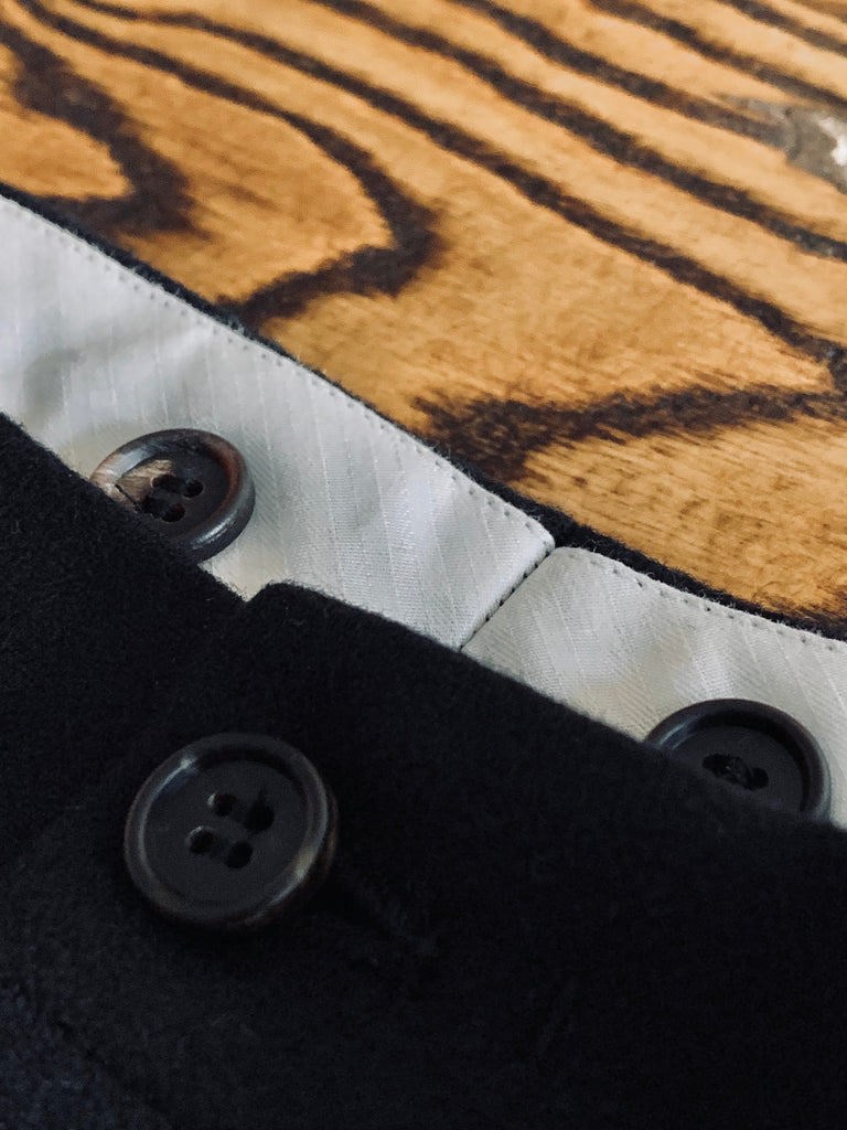 Side adjusters complete the 30s look with classic hardware. The patterns used are inspired by vintage tailoring patterns completed by a master tailor.