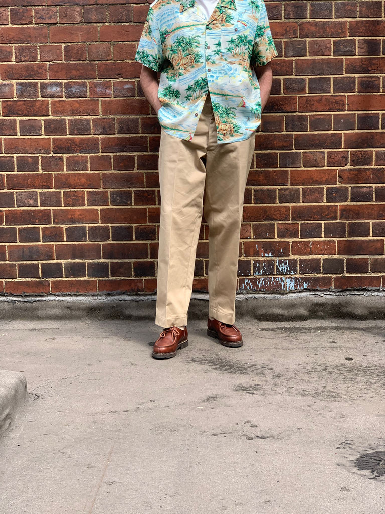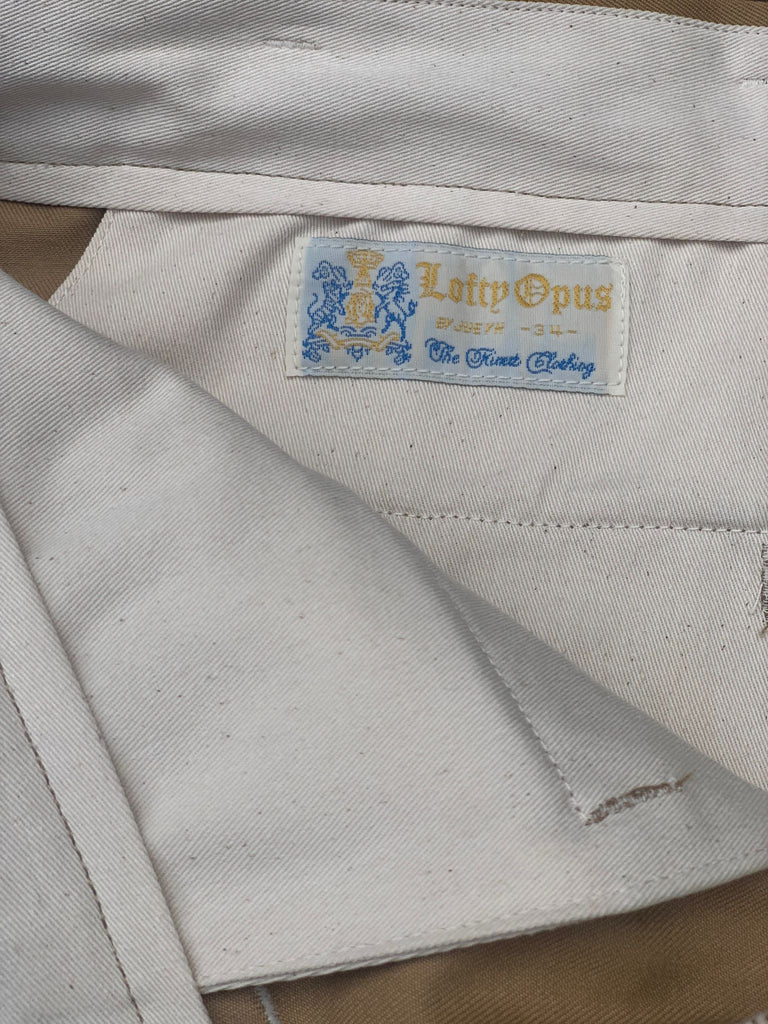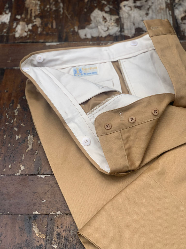 These trousers feature a silhouette, lining-making technique, narrow belt loop, and a button fly detail that were popular from the 1930s to the 1940s.
