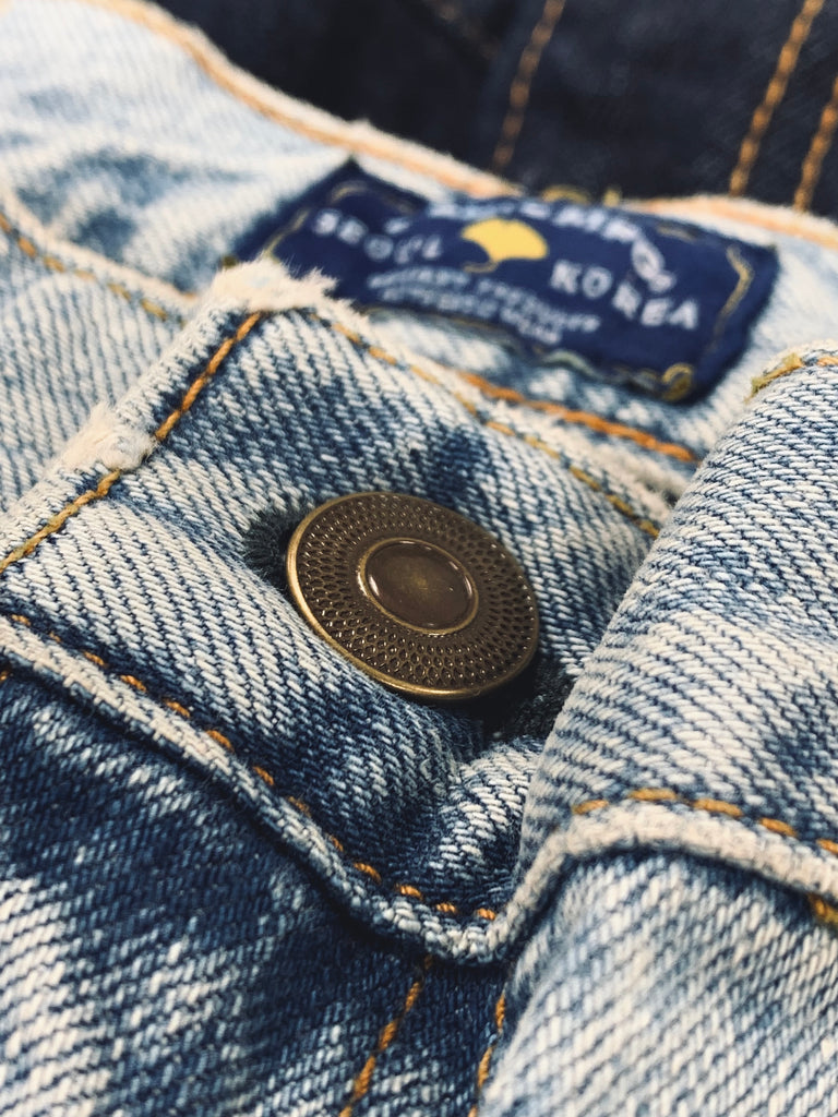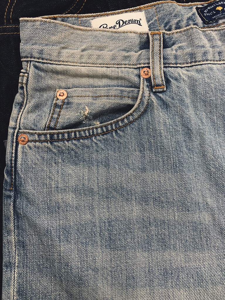 Double chain stitch on the waist, coin pocket with one rivet and distressing, universal zipper, diagonal bar-tack on the back shield pocket and wide hem chain stitching.