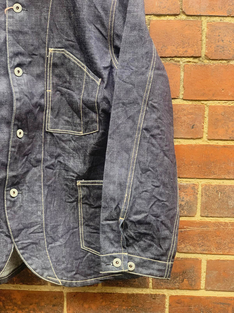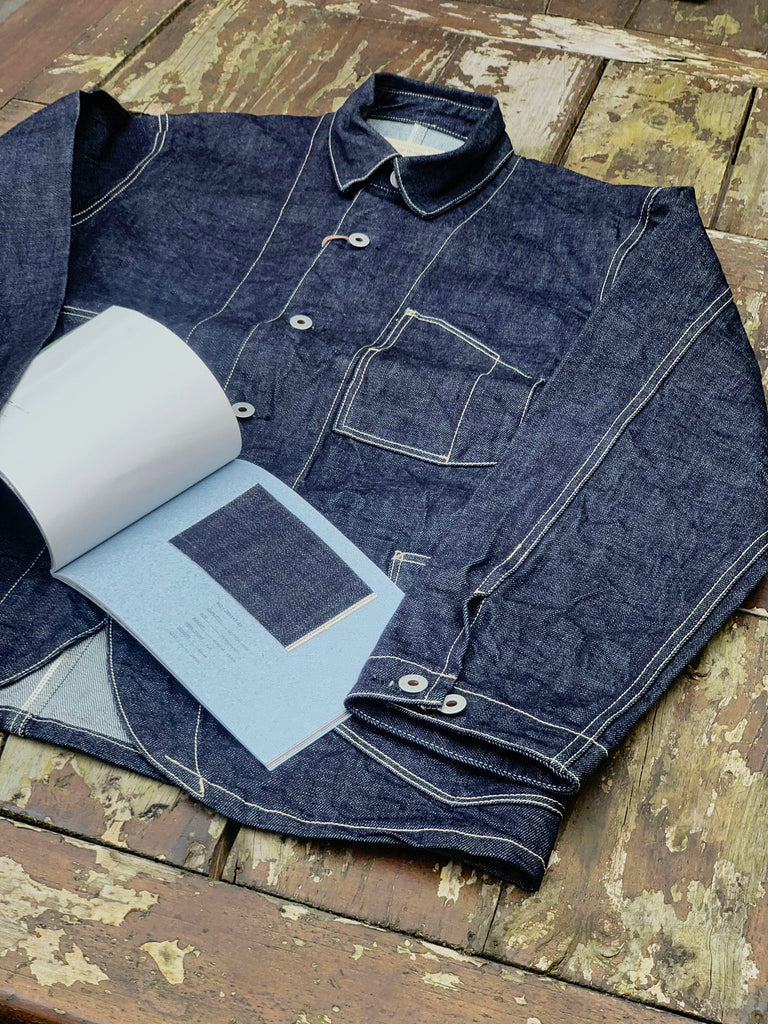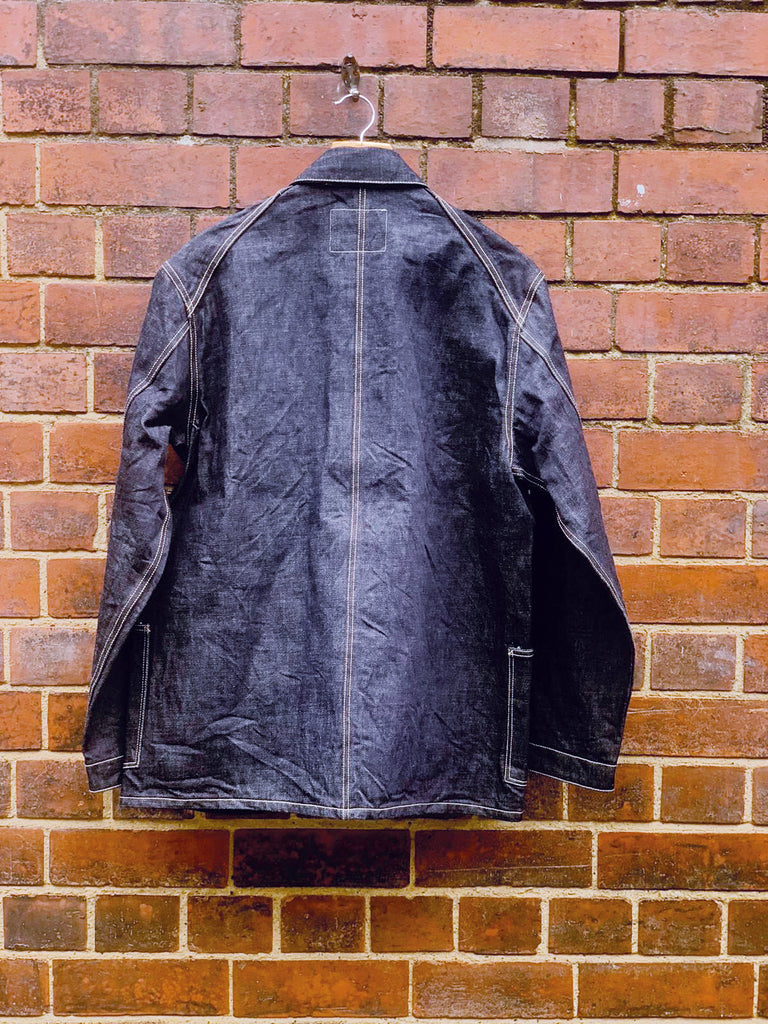 Replica of a work-wear cover-all jacket used by fishermen in the early 1900s, one garment characterized by two tuck sleeves, chests, watch pockets, and a service at the centre of the back.