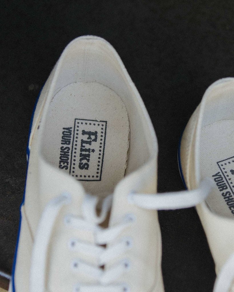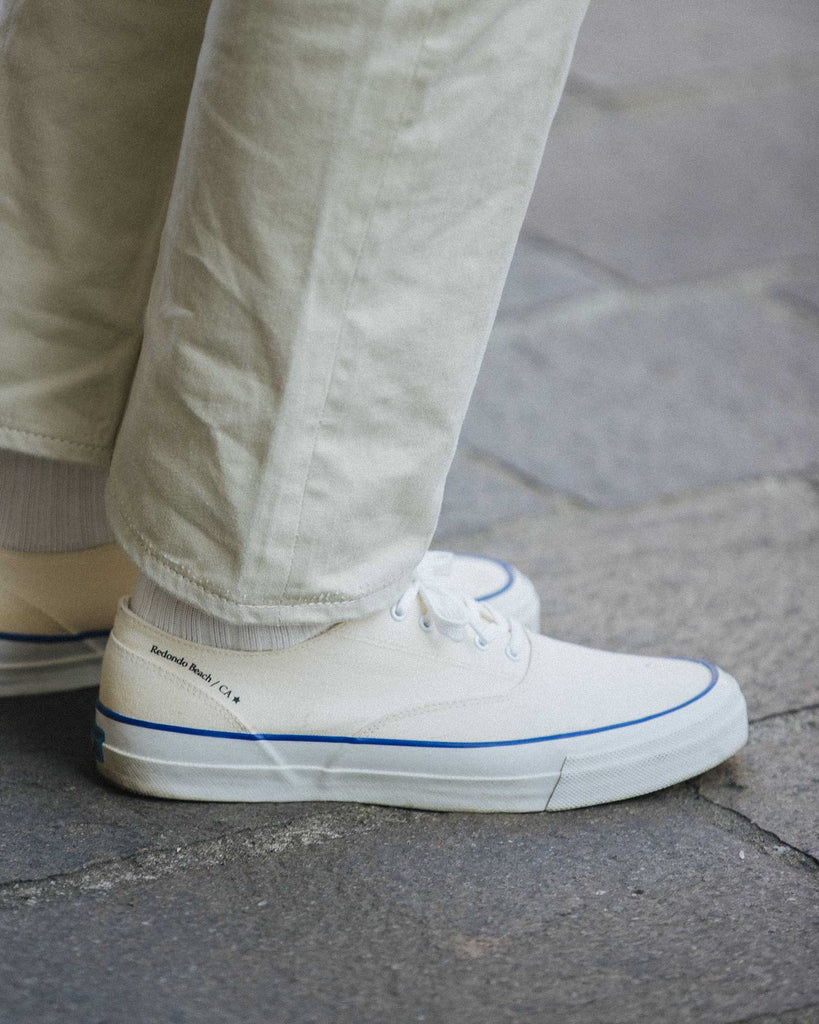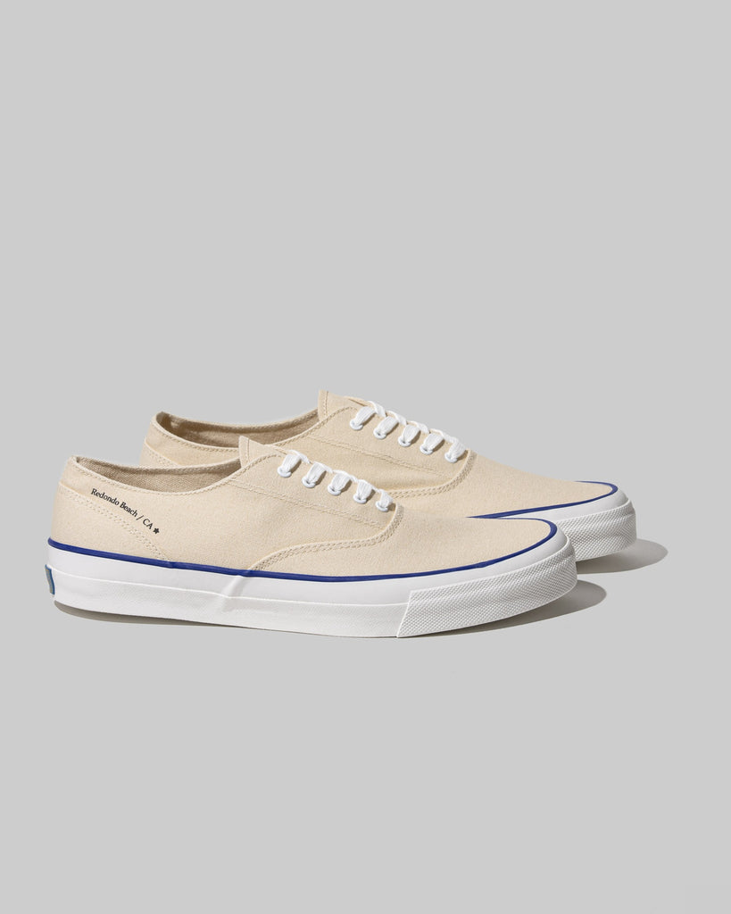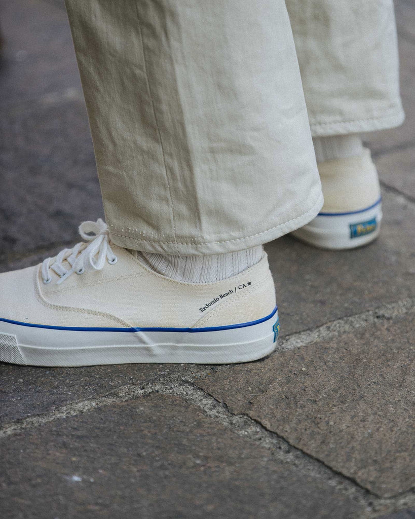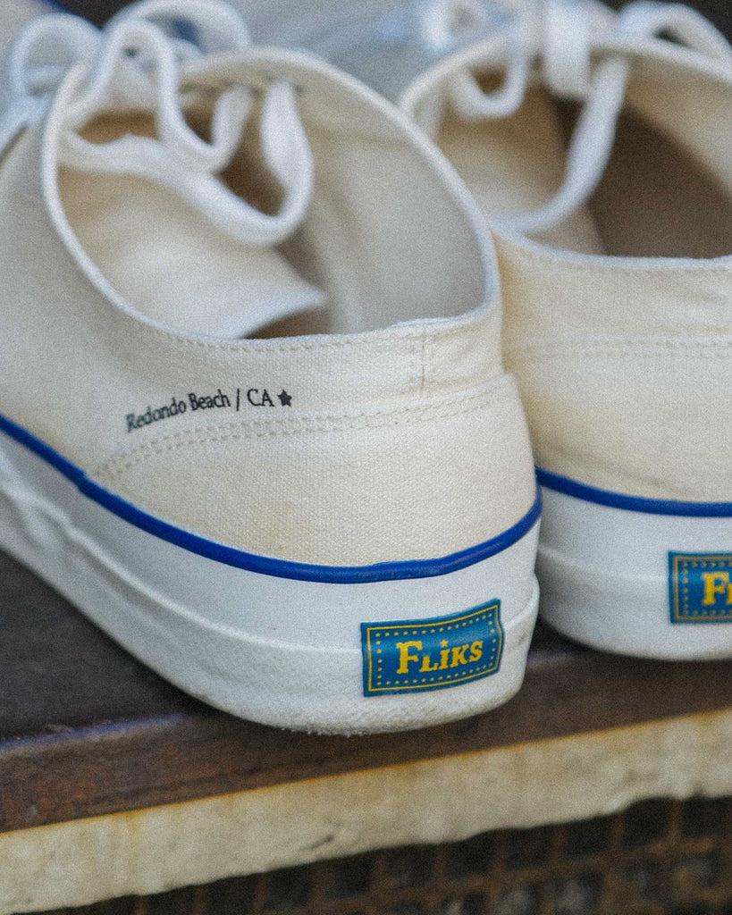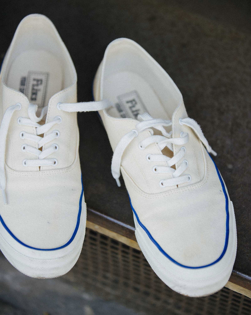 Mr. Fliks' design is derived from the deck shoes of the US Navy during World War II - a classic look. This iteration of the style features a low-cut, lace-up canvas upper, metal eyelets, and a rubber outsole. This timeless silhouette pairs easily with everything from jeans to chinos.