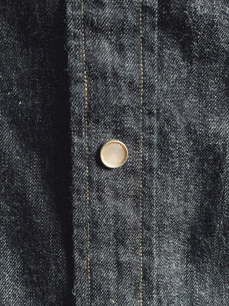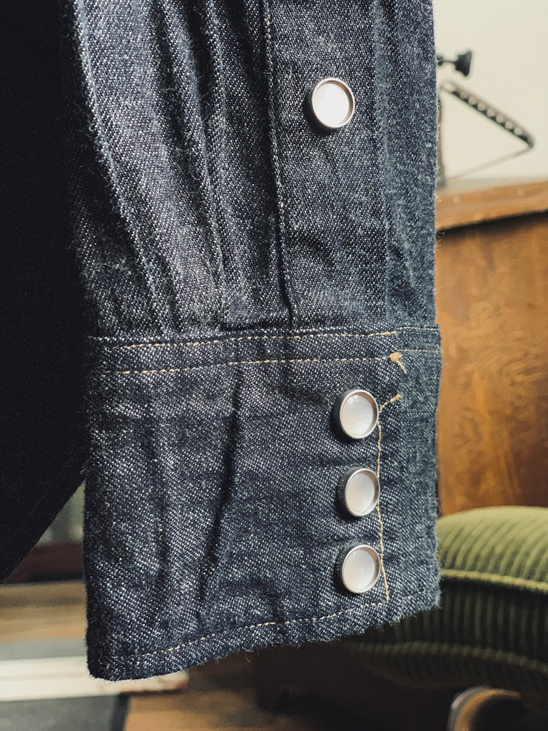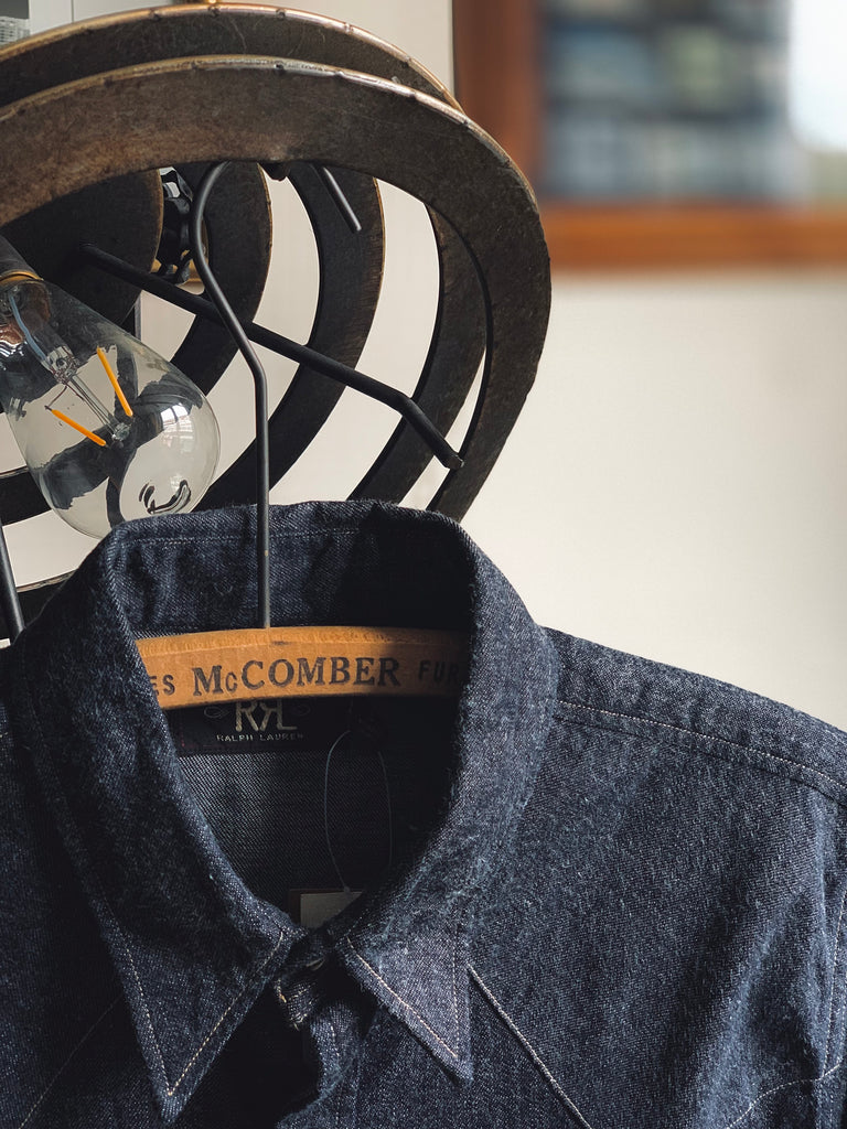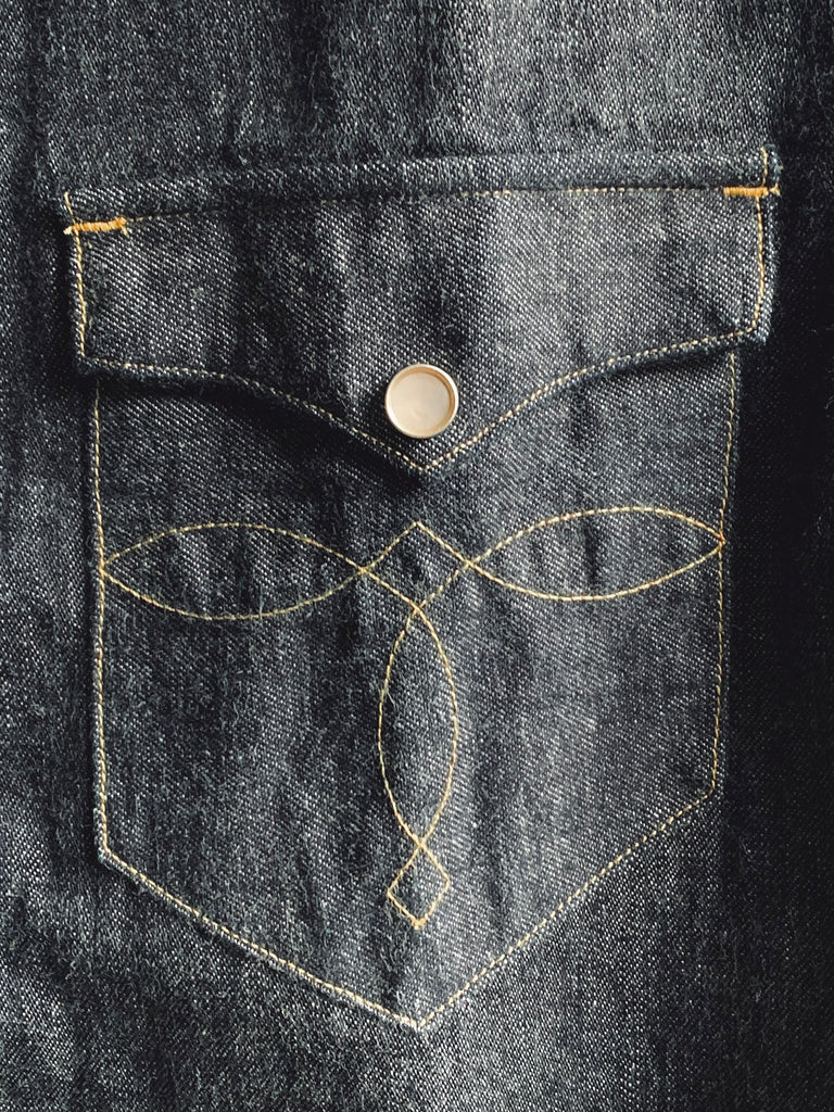 RRL western denim rinse shirt. This shirt features western motifs across the chest and two patch pockets, alongside pearl-snap buttons on the placket, pockets and cuffs.