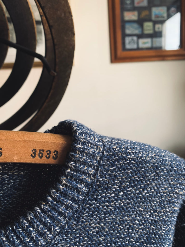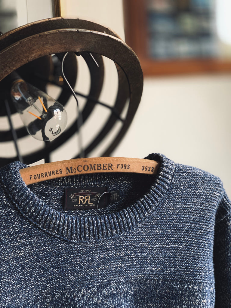 RRL marl crew neck sweater. This garment features a thick knit, ribbed neckline and versatile marled colour. The knit of this item contrasts in the top third of the item, providing greater visual interest.