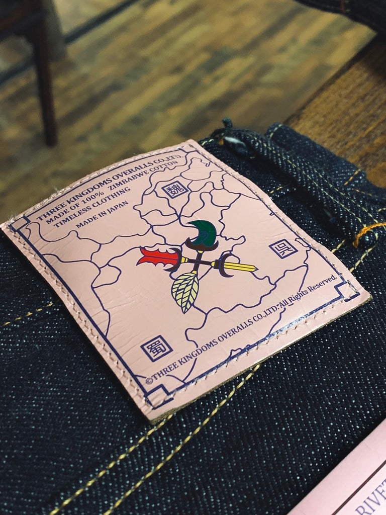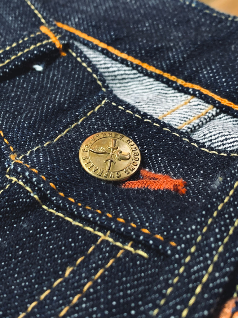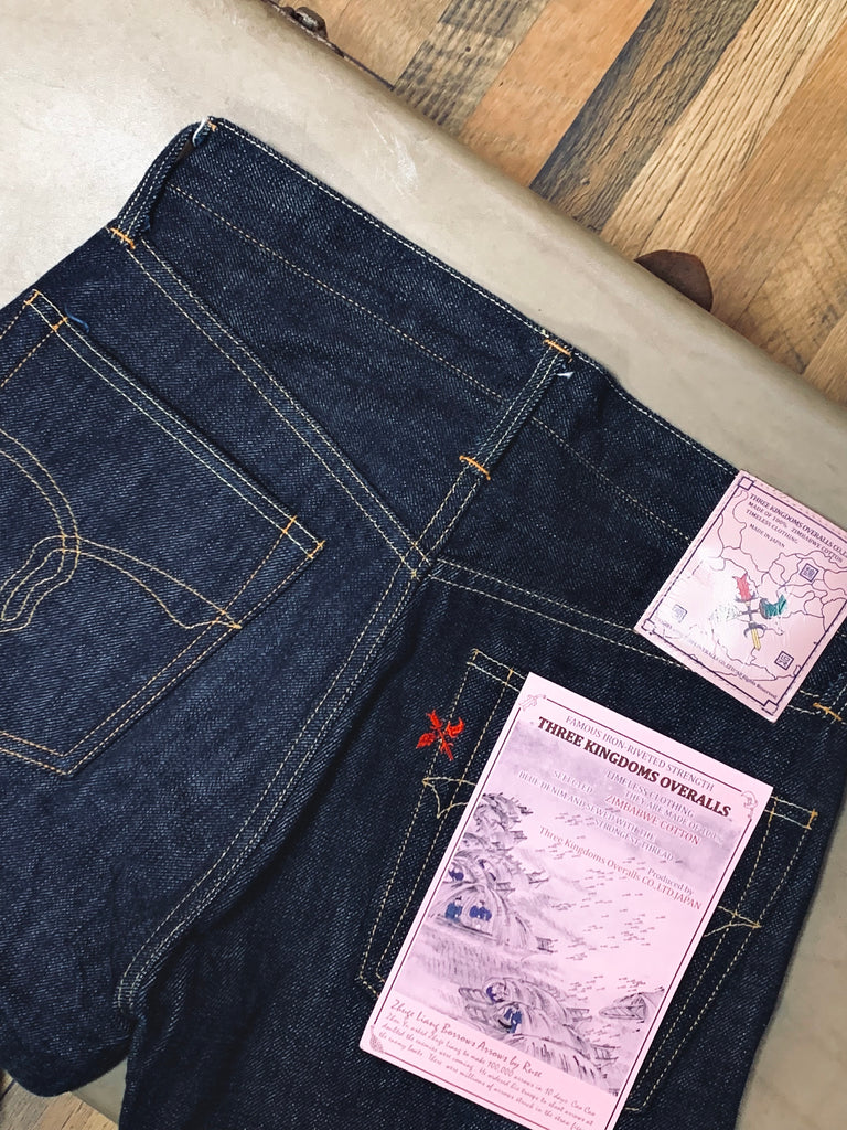 Three Kingdoms Overalls classic straight fit natural indigo selvedge denim pants. These pants feature 100% natural indigo dyed 15.3oz selvedge denim, woven on an old-style G type power loom, using 100% high quality long staple Zimbabwean cotton. Details include; 100% natural indigo rope dyeing, relax tapered silhouette, button fly, Three Kingdoms stamped solid brass top button, engraved solid brass donut buttons, special order 10.4mm TKDO & Co. stamped solid copper rivets, red embroidery, chain stitching, reinforcements throughout and much more!