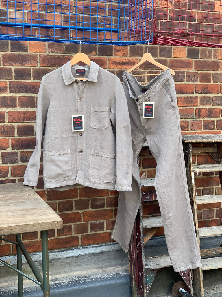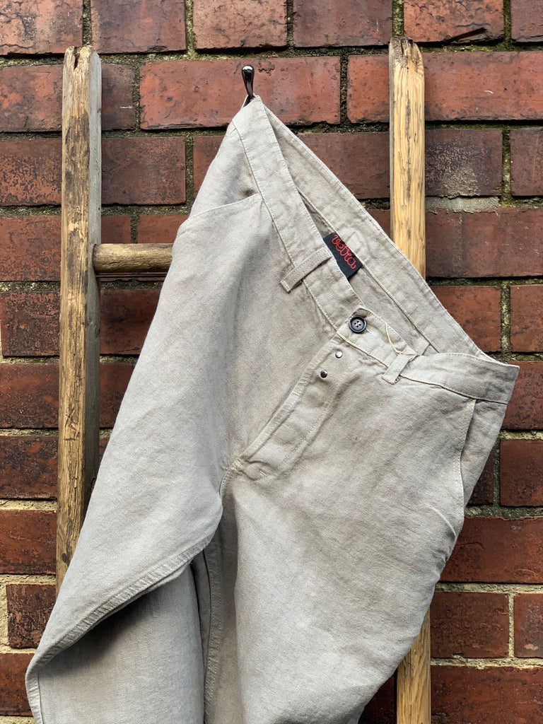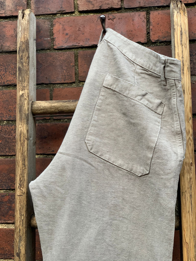 The genuine French workwear trousers, in heavy linen fabrics, authentic workwear pants, Buttonned fly with authentic metal hook, italian pockets, 2 rear pockets.